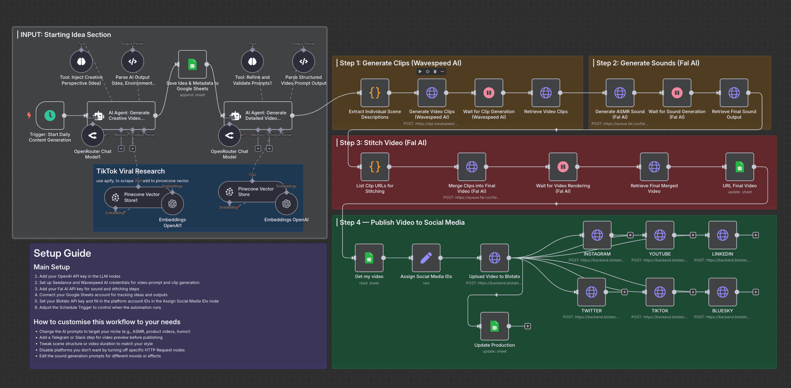 A daily content pipeline crafting ideas, producing video clips, integrating sounds, and automatically publishing across TikTok and beyond—all completely automated.